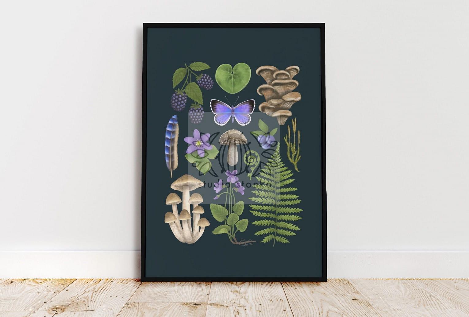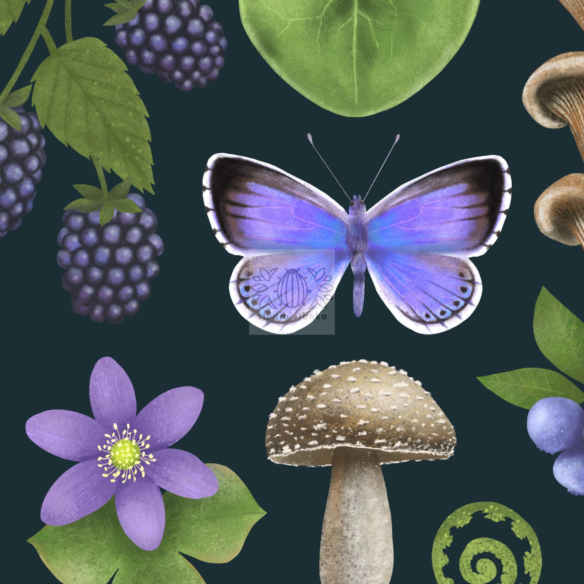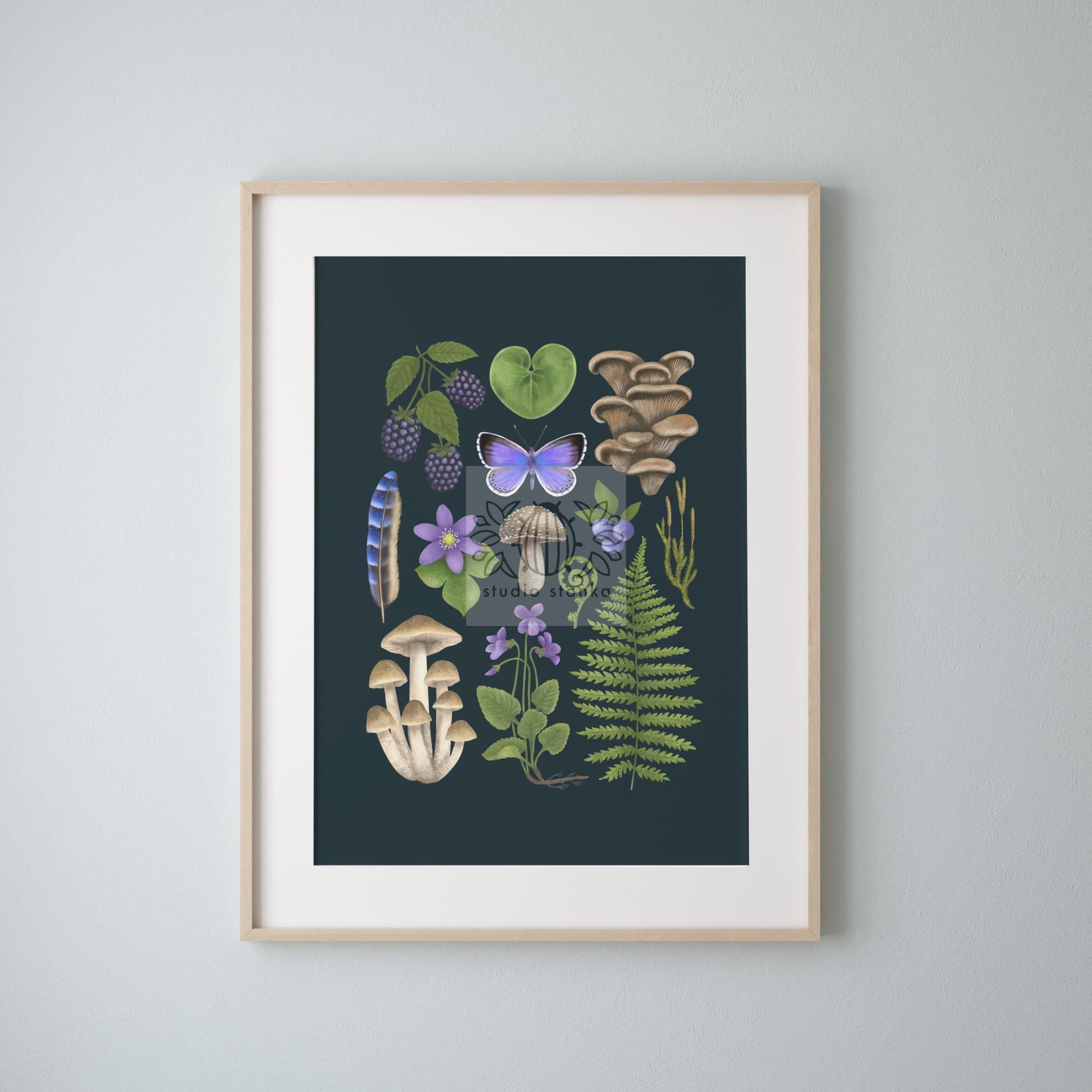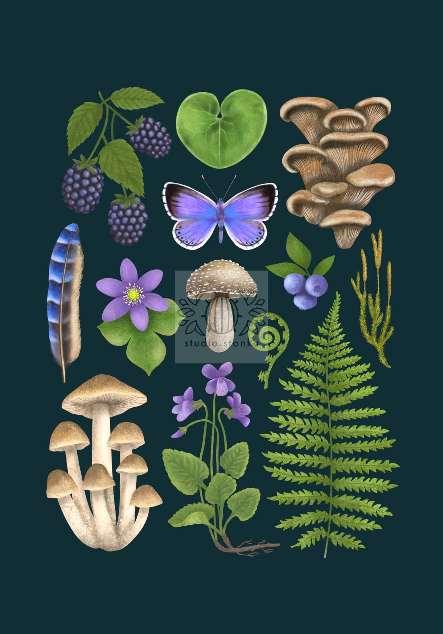 Autorski plakat przedstawiający elementy runa leśnego takie jak: jeżyny, jagody, liście paproci i kopytnika, przylaszczkę, mech, grzyby oraz motyla. Wszystkie te elementy zamknięte są w uporządkowanej i wyważonej kompozycji, a kolory dobrane tak, żeby wprowadzać spokój do wnętrza. Ilustracja przywodzi na myśl spacer po lesie.